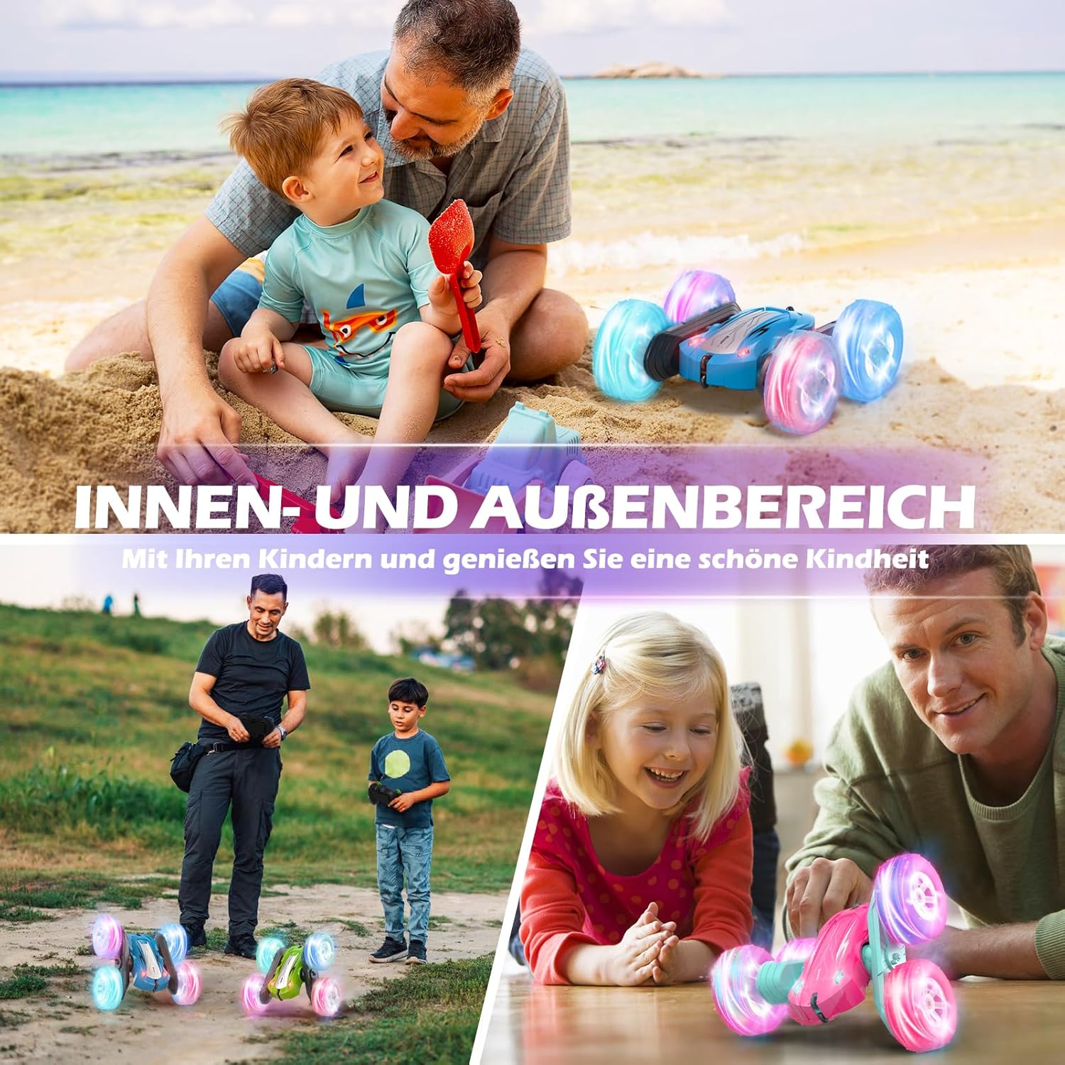 - 【Creative Toys】:The rc car is not only able to rotate 360° and flip both sides, it can also perform stunts at high speed. With four LED headlights and cool lighting effects on the tyres, it will catch your eye whether outdoors or indoors